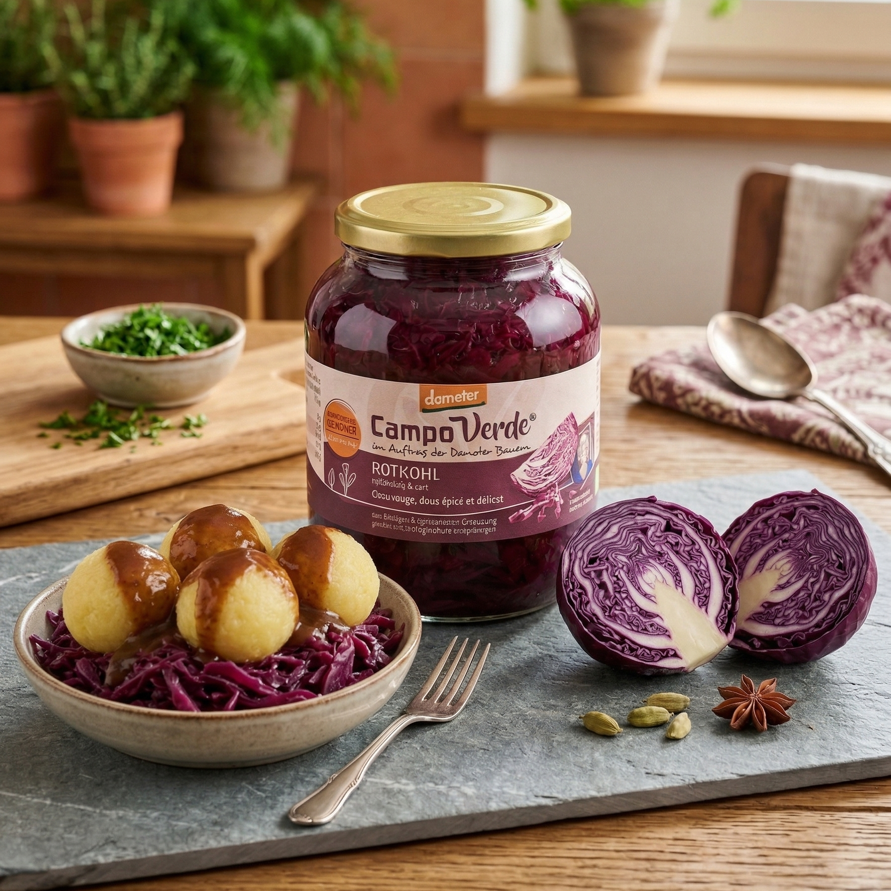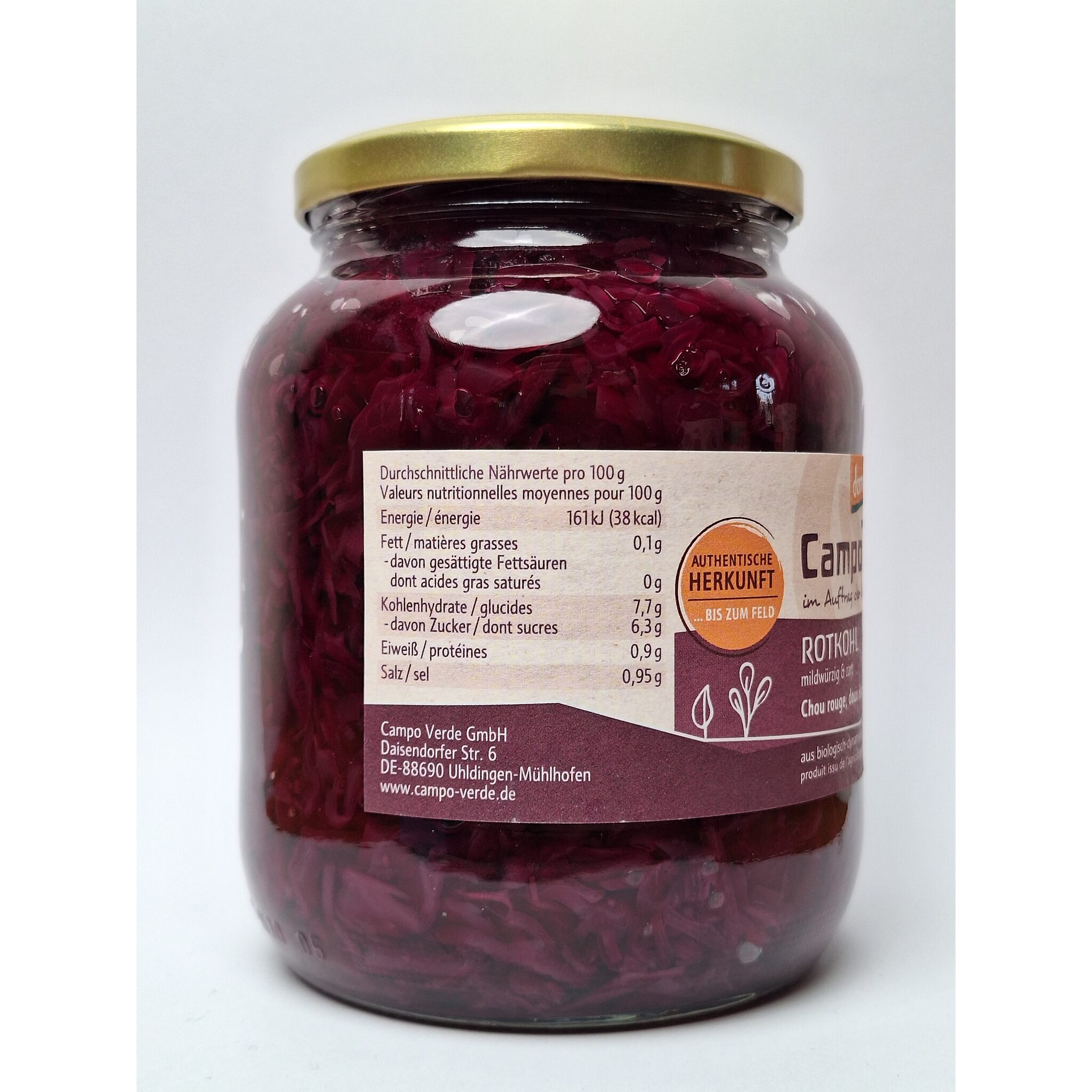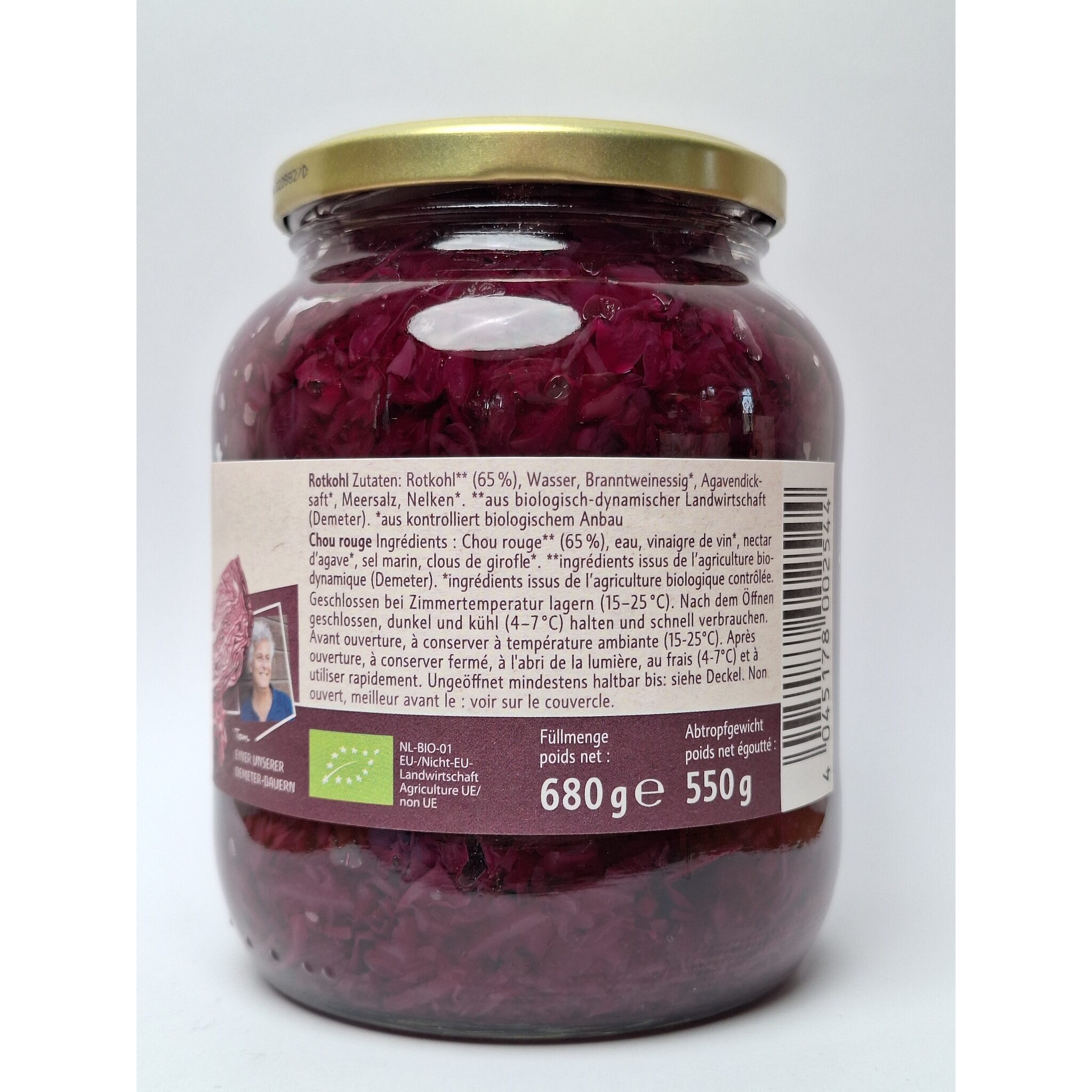 Rotkohl** (65 %), Wasser, Branntweinessig*, Agavendicksaft*, Meersalz, Nelken*.