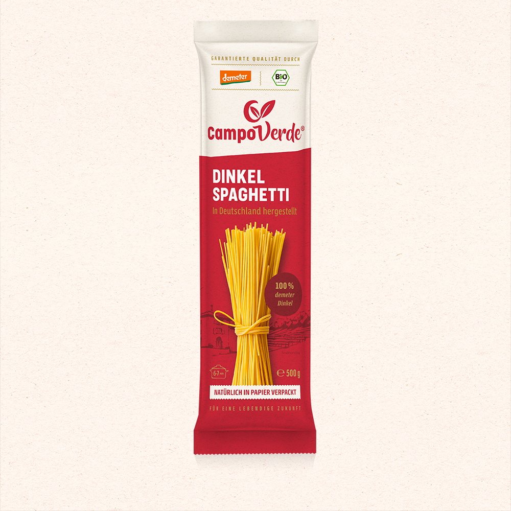 Unsere fein-nussigen Dinkel Spaghetti werden aus baden-württembergischem Demeter-Dinkel und nach traditioneller Rezeptur hergestellt.